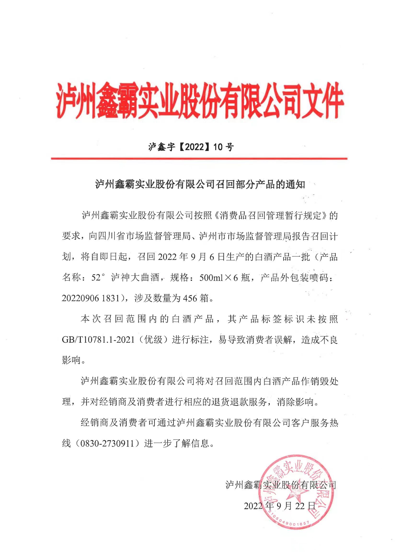 瀘州鑫霸實(shí)業(yè)股份有限公司召回部分產(chǎn)品的通知